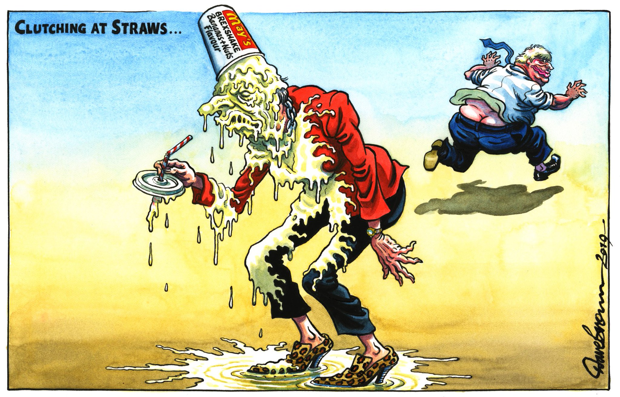 È intitolata clutching at straws, “appigliarsi a qualunque cosa” (letteralmente a fili di paglia, ma straw è anche la cannuccia) pur di salvarsi in una situazione disperata, che è quella in cui si trova May in questi giorni, incapace di trovare un accordo sulla Brexit e sotto pressione da parte del suo partito che le ha voltato le spalle e ne vuole le dimissioni.